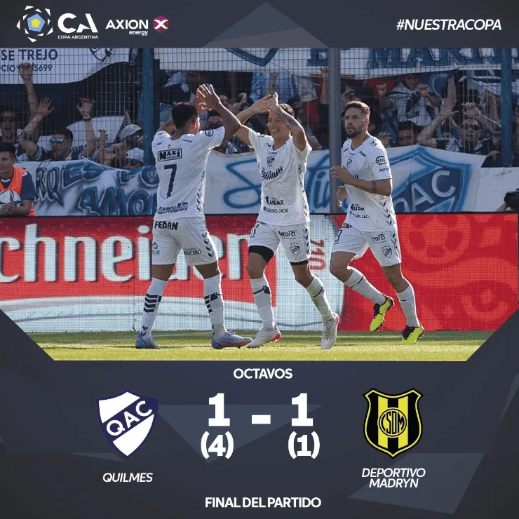 Luego de una apasionante tanda, finalmente fue Quilmes el equipo que logró el pase a cuartos tras un 4 a 1 en la definición por penales, siendo el único equipo del ascenso que queda en la Copa Argentina. Sin fecha a confirmar aún, pero con una estimada a fines de septiembre (el 28), Quilmes se medirá con Boca al meterse entre los ocho mejores del certamen.