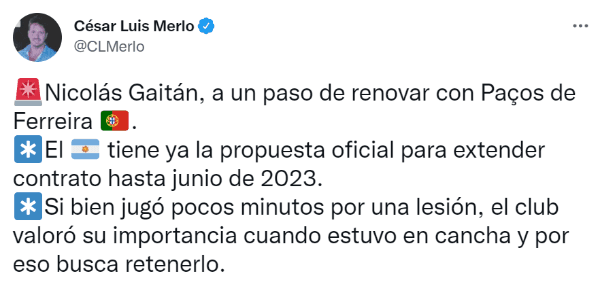 Durante las últimas horas, Gaitán recibió una propuesta dePaços de Ferreira para renovar su vínculo en Portugal hasta junio de 2023. Y en su cuenta de Twitter, el periodista César Luis Merlo explicó que“si bien jugó pocos minutos por una lesión, el club valoró su importancia cuando estuvo en cancha y por eso busca retenerlo”.