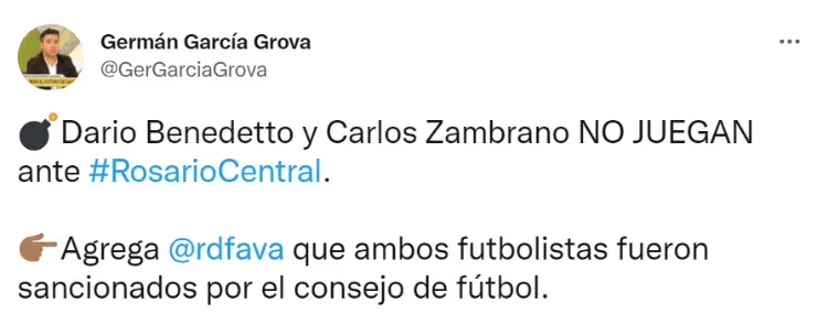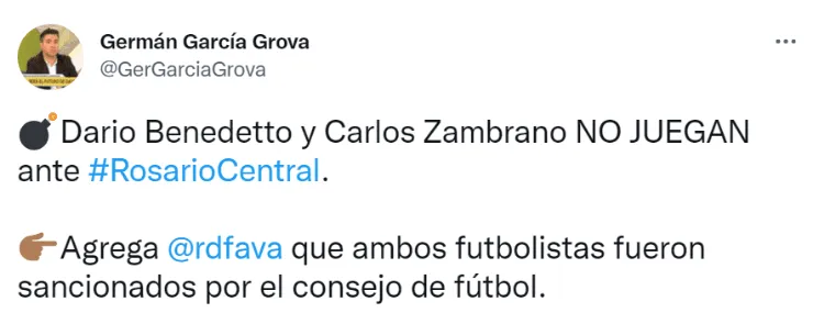 Después de que los comandados por Ibarra se entrenaran con la cabeza puesta en el choque ante Rosario Central, a quien recibirán este miércoles, desde el Consejo de Fútbol ya tomaron una drástica decisión para con Benedetto y Zambrano. Según indicó el periodista Germán García Grova, no jugarán frente al Canalla. De esta manera, Riquelme quiere marcarles la cancha a ambos.