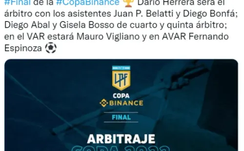 A pocas horas de confirmarse el horario del partido, que se llevará a cabo en el Estadio Mario Alberto Kempes a partir de las 16:00 horas, las autoridades de la Liga Profesional dieron a conocer el cuerpo arbitral que impartirá justicia en el duelo definitorio entre el Xeneize y el Matador.