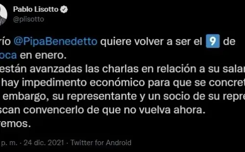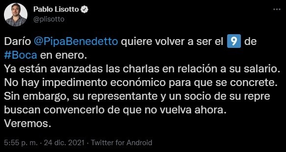 “Darío Benedetto quiere volver a ser el nueve de Boca en enero. Ya están avanzadas las charlas en relación a su salario. No hay impedimento económico para que se concrete. Sin embargo, su representante y un socio de su repre buscan convencerlo de que no vuelva ahora. Veremos”, informó el periodista Pablo Lisotto. El agente de Benedetto es Christian Bragarnik, propietario del Elche.