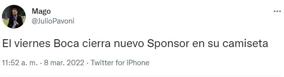 Según reveló el periodista Julio Pavoni en su cuenta de Twitter, “el viernes Boca cierra nuevo sponsor en su camiseta”. De esta manera, se vendría un cambio en la indumentaria azul y oro.