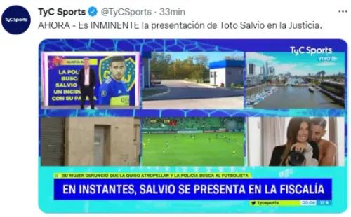 Entre tantos medios en los que se difundió el video, TyC Sports sacó a la luz la cinta y dio a conocer que es “inminente” la presentación de Salvio a declarar, dejando atrás cualquier versión de falta de participación del delantero para poder esclarecer el incidente. Además, el jugador no se presentará a entrenar con el plantel de Sebastián Battaglia.