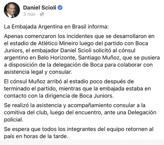 “Apenas comenzaron los incidentes que se desarrollaron en el estadio de Atlético Mineiro luego del partido con Boca Juniors, el embajador Daniel Scioli solicitó al cónsul argentino en Belo Horizonte, Santiago Muñoz, que se pusiera a disposición de la delegación de Boca para colaborar con asistencia legal y consular”, explicó