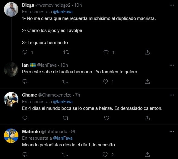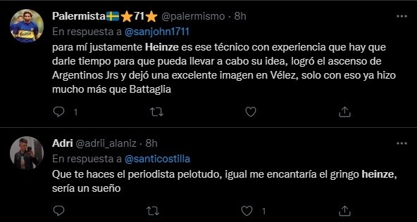 De la nada, muchos hinchas del Xeneize en Twitter pidieron por Gabriel Heinze. “Es ahora”, publicó uno junto a un video en el que el “Gringo” le responde con todo a un periodista. “Es ese técnico con experiencia al que hay que darle tiempo para que pueda llevar a cabo su idea”, expuso otro.
