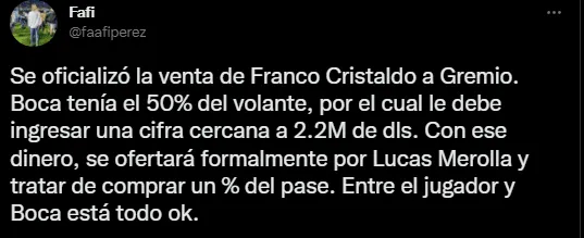 Según confirmó el periodista Facundo Pérez afirmando que esta venta se confirmó en un 100% y se le compró la totalidad del pase. Además, añadió:”Boca tenía el 50% de Cristaldo, por el cual le debe ingresar una cifra cercana a 2.2M de dólares. Con ese dinero, se ofertará formalmente por Lucas Merolla y tratar de comprar un porcentaje del pase. Entre el jugador y Boca está todo ok“. De esta forma, todo más que encaminado para que Merolla se ponga la camiseta azul y oro a partir del 2023.