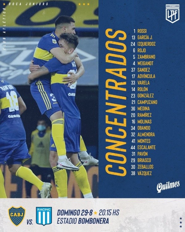 En medio de ese panorama, este viernes, Battaglia le puso punto final al misterio y confirmó la lista de convocados para recibir a la Academia. En la misma se desprenden tres bajas considerables por diversas complicaciones físicas. Se trata de Lisandro López, Frank Fabra y Edwin Cardona, quienes no podrán estar a disposición.