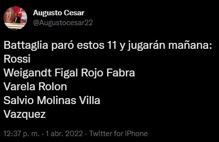 En la práctica de este viernes, el director técnico formó con: Agustín Rossi; Marcelo Weigandt, Nicolás Figal, Marcos Rojo, Frank Fabra; Alan Varela, Esteban Rolón; Eduardo Salvio, Aaron Molinas, Sebastián Villa; y Luis Vázquez. Y utilizó un esquema 4-2-3-1.