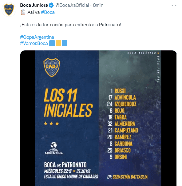Boca confirmó su alineación vía redes sociales y saldrá conAgustín Rossi; Luis Advíncula, Carlos Izquierdoz, Marcos Rojo, Frank Fabra; Agustín Almendra, Jorman Campuzano, Juan Ramírez; Edwin Cardona; Nicolás Orsini y Norberto Briasco. A partir de las 21:30 horas, el Xeneize se verá las caras con el Patrón y ambos buscarán quedar entre los 4 mejores equipos de la Copa Argentina.