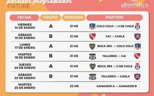 El primer partido de Boca en el torneo amistoso será el lunes 17 de enero de 2022, cuando se medirá con Colo-Colo de Chile. Más tarde, el jueves 20 del mismo mes, se enfrentará con Universidad de Chile. En caso de avanzar a la final, jugará el martes 25.