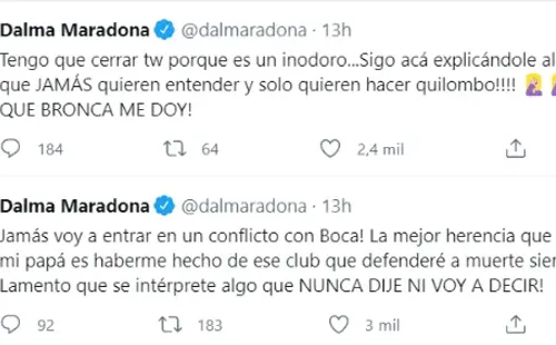 Y siguió: “Jamás voy a entrar en un conflicto con Boca! La mejor herencia que me dejo mi papá es haberme hecho de ese club que defenderé a muerte siempre! Lamento que se intérprete algo que NUNCA DIJE NI VOY A DECIR!. Tengo que cerrar tw porque es un inodoro…Sigo acá explicándole algo a los que JAMÁS quieren entender y solo quieren hacer quilombo!!!! QUE BRONCA ME DOY!”.
