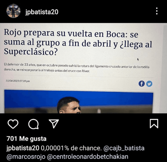 El médico del club, que es quien se encarga de la gran mayoría de las cirujías y rehabilitacionesde los jugadores en lesiones graves, citó una noticia que hablaba de la chance de tener a Rojo listo para el Superclásico. “0,00001% de chance”, escribió.