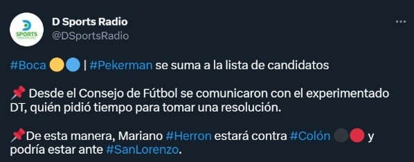 A lo largo de las últimas horas, en D-Sports Radio afirmaron que nuevamente “Pekerman se suma a la lista de candidatos”, e inmediatamente añadieron que “desde el Consejo de Fútbol se comunicaron con el experimentado DT, quién pidió tiempo para tomar una resolución”.