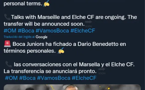 “Boca Juniors ha fichado a Darío Benedetto en términos personales. Las conversaciones con el Marsella y el Elche CF están en curso. La transferencia se anunciará pronto“, posteó el cronista. De cerrarse en su totalidad, Boca tendrá en sus filas al tan ansiado delantero de jerarquía que busca hace tiempo, ni más ni menos que con el Pipa siendo éste. Para sumar aún más ilusión para el Xeneize, el Elche jugó esta tarde por la liga de España y Benedetto no vio minutos.