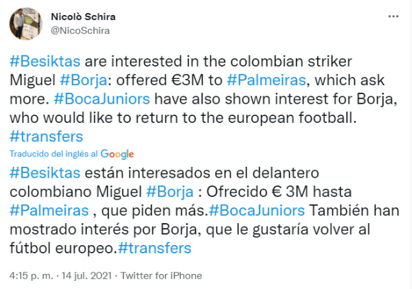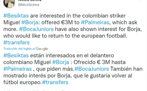 Sin embargo, no todo es color de rosa. La información que se había difundido la última semana era que Palmeiras ya había aceptado la oferta del Xeneize por Miguel Borja, cercana a los 3 millones de dólares; solo restaba resolver el contrato. No obstante, el periodista italiano Nicolò Schira afirmó que el Besiktas hizo un ofrecimiento similar al de Boca y que el jugador colombiano estaría interesado en retornar al fútbol europeo.