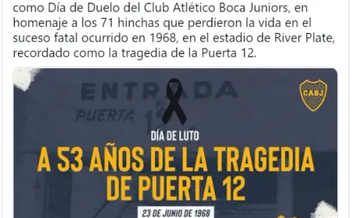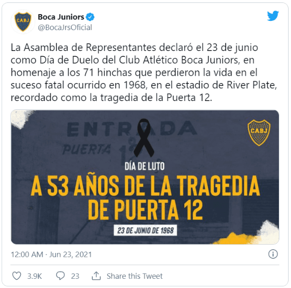 “La Asamblea de Representantes declaró el 23 de junio como Día de Duelo del Club Atlético Boca Juniors, en homenaje a los 71 hinchas que perdieron la vida en el suceso fatal ocurrido en 1968, en el estadio de River Plate, recordado como la tragedia de la Puerta 12”, comunicó Boca.