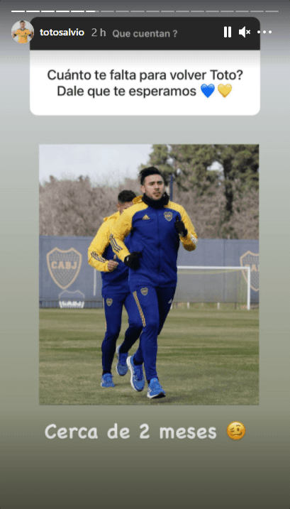 Rápidamente, el jugador respondió con una foto vistiendo la indumentaria de entrenamiento de Boca y escribió: “Cerca de dos meses”. Esto significa que Salvio podrá estar de vuelta en las canchas para mediados de octubre, lo que es una noticia positiva para el equipo de Miguel Ángel Russo y que sería una especie de refuerzo para el plantel de la temporada 2021/2022.
