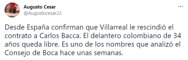 Según informó Augusto César vía Twitter, Román tuvo el nombre de Bacca en carpeta para esta ventana de traspasos y la información desde España es la rescisión del colombiano con el actual campeón de la Europa League. La carta de libertad del atacantepodría facilitar las negociaciones para que el Consejo de Fútbol intente convencerlode desembarcar en el Xeneize.