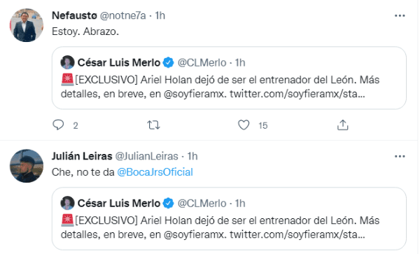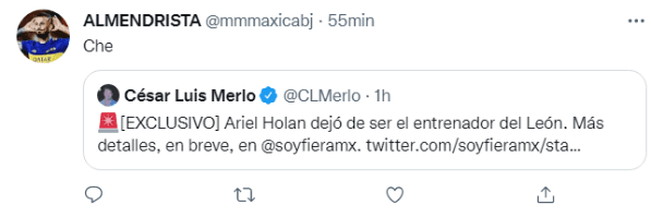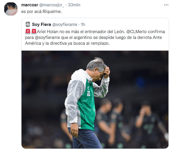 Fanáticos de San Lorenzo, Vélez, Universidad Católica, Independiente, entre otros, se manifestaron en Twitter para que sus respectivas dirigencias vayan a buscarlo, convirtiendo al DT en una de las tendencias en la red social del pajarito azul. No obstante, algunoshinchas de Boca también hicieron su pedido a pesar del negativo historial del Xeneize con el exentrenador de León en medio de una crisis en el club. ¿Será uno de los considerados por el Consejo de Fútbol?