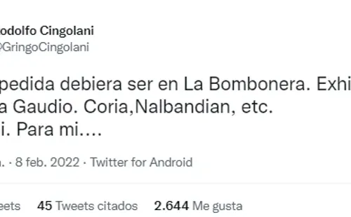 Pese a la ovación de su gente, podría decirse que el homenaje quedó corto. Por eso, la idea que propuso el periodista Rodolfo Cingolani en su cuenta de Twitter parece haber logrado mucha adhesión.