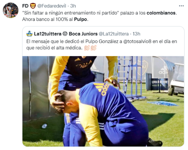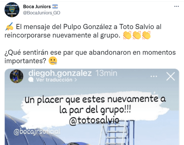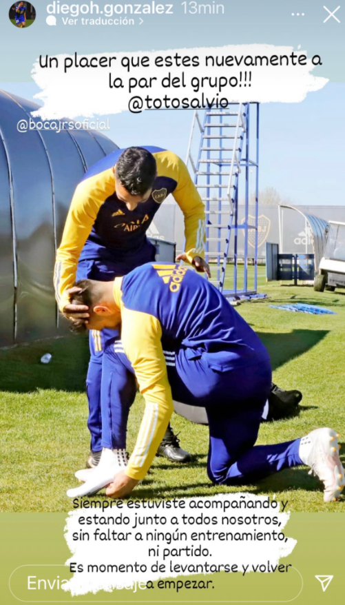 Entre tantos mensajes de bienvenida, Diego González le dedicó a Salvio una historia de Instagram para felicitarlo por su regreso a los entrenamientos. “Un placer que estés nuevamente a la par del grupo @totosalvio!!!”, escribió el Pulpo en sus redes sociales. Posteriormente, el volante le agradeció todo lo que hizo en estos meses por el plantel y varios hinchas lo tomaron como una dedicatoria especial…
