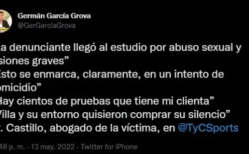 Después de conocerse la denuncia hacia Sebastián Villa por “violación e intento de homicio”, hubo más novedades en el caso. La mujer que acusó al futbolista de Boca dio su testimonio, que quedó registrado en la causa en el juzgado de Lomas de Zamora, y ahora habló el Roberto Castillo, abogado de la denunciante, en TyC Sports: “Villa y su entorno quisieron comprar su silencio”.