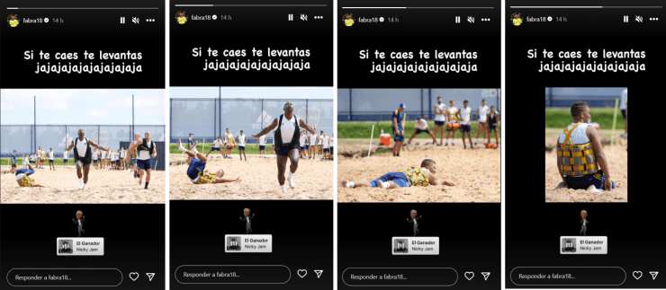 Se trata de Frank Fabra, quien en uno de los trabajos cayó y quedó desparramado en la arena. El lateral izquierdo subió la divertida secuencia de fotos del momento y, entre risas, escribió: “Si te caes te levantas jajajaja”. ¡Cuidado, Frank!