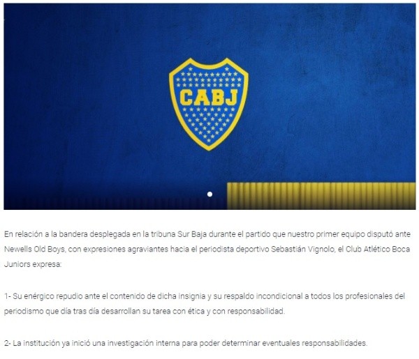 De parte de Vignolo no hubo declaraciones oficiales pero el club de la Ribera sí publicó un comunicado al respecto. Boca decidió dar un mensaje “en relación a la bandera desplegada en la tribuna Sur Baja durante el partido que nuestro primer equipo disputó ante Newells Old Boys, con expresiones agraviantes hacia el periodista deportivo Sebastián Vignolo”.
