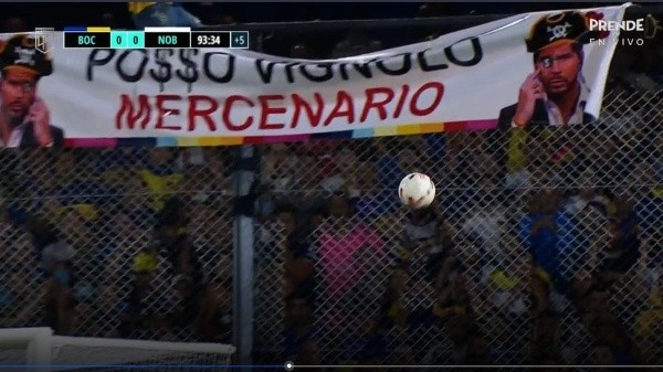 Los que estuvieron en La Bombonera pudieron observar la situación desde un primer momento. Pero el resto también pudo enterarse debido a que, por una cuestión puntual, se observó a través de la transmisión oficial: un grupo de hinchas de Boca desplegó en el estadio una bandera contra Sebastián Vignolo.