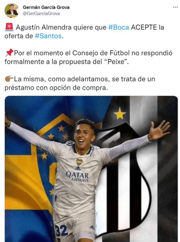 El periodista de TyC Sports añadió que “por el momento el Consejo de Fútbol no respondió formalmente a la propuesta del ‘Peixe”, pero el pedido de Almendra podría alterar los planes para que el Xeneize se esfuerce en poder cerrar una operación que conforme a todas las partes. El mercado de pases en Brasil cierra el 22 de marzo y son horas decisivas.