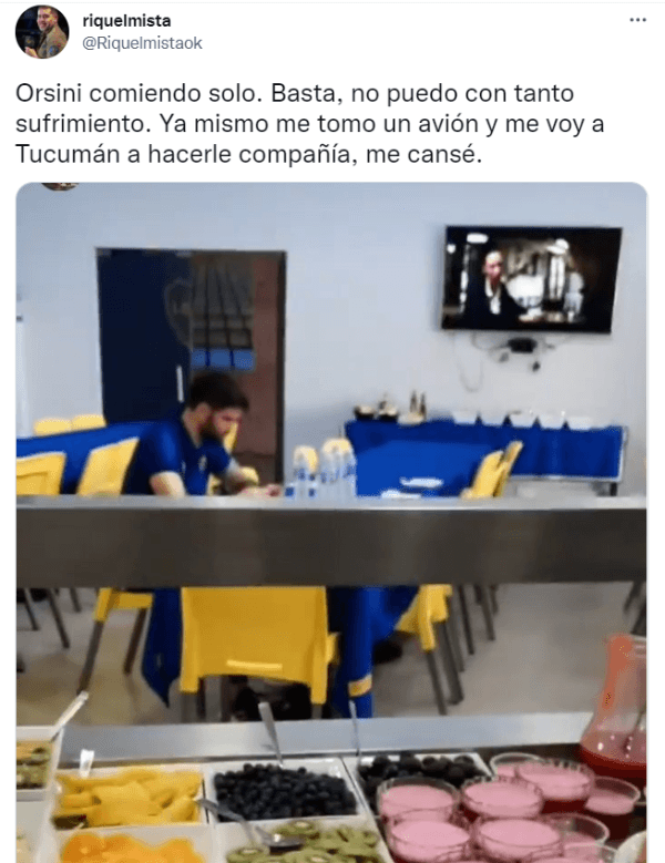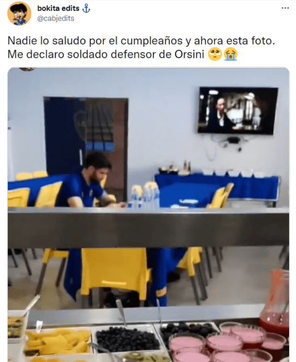 De todas formas, el nombre del exdelantero de Lanús fue tendencia en redes sociales en la previa del partido y no por motivos futbolísticos. En redes se hizo viral un video publicado por un empleado de Boca, donde se lo ve a Orsini comiendo en un salón completamente a solas. Esto hizo que algunos hinchas crearan una “teoría” acerca de la soledad del atacante en algunas fotos que publica el Xeneize. Nada más lejos de la realidad…