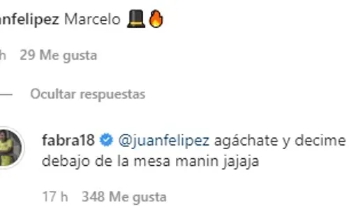 Frank posteó una imagen en su cuenta de Instagram donde se lo ve entrenando con la indumentaria de Boca. Posteriormente, el usuario @juanfelipez abrió la conversación con un comentario.“Marcelo”. La reacción de Fabra fue desopilante: “Agáchate y decime que hay debajo de la mesa manin jajaja”. Con un clásico chiste, el colombiano generó las risas en redes.