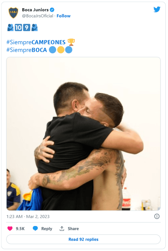 Tal como sucedió en cada uno de los seis títulos de su gestión, Román bajó a agradecerle a los futbolistas en el vestuario y allí se reencontró con el Pipa. Ambos se dieron un fuerte abrazo y la cuenta oficial del club se encargó de compartirlo en sus redes sociales. Para el hincha es una caricia.