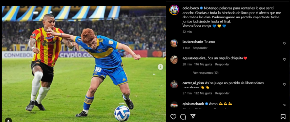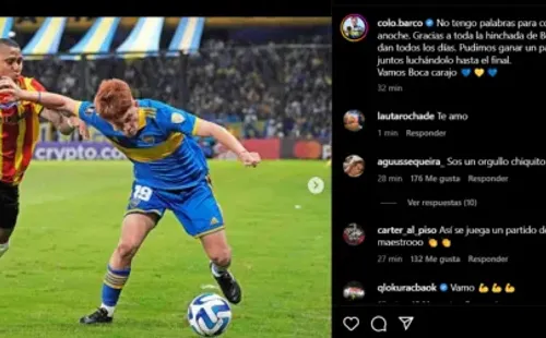 “No tengo palabras para contarles lo que sentí anoche. Gracias a toda la hincha de Boca por el afecto que me dan todos los días. Pudimos ganar un partido importante todos juntos luchándolo hasta el final. Vamos Boca carajo”, exteriorizó Barco, que, inmediatamente, recibió palabras de aprobación de los fanáticos del elenco Xeneize.