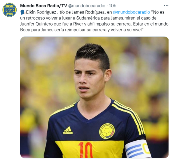 Apenas se conoció el interés azul y oro por el volante cafetero, uno de sus familiares alzó la voz para referirse al tema que tiene locos a los hinchas de Boca.Elkin Rodríguez, tío de James, dialogó en exclusiva conMundo Boca Radioy aseguró que“no es un retroceso volver a jugar a Sudamérica” y que“la llegada de James a Boca sería ideal para relanzar su nivel y que vuelva a tener su nombre en las orbitas grandes”, dando como ejemplo lo que ocurrió con Juanfer Quintero en River.