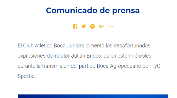 “El Club Atlético Boca Juniors lamenta las desafortunadas expresiones del relator Julián Bricco, quien este miércoles durante la transmisión del partido Boca-Agropecuario por TyC Sports, celebró la patada que terminó con la lesión del jugador xeneize Exequiel Zeballos, y también el tuit del mismo canal de deportes que intentaba hacer un meme con la agresión, y que luego fue eliminado. Desde Boca llamamos una vez más a todos los actores del fútbol y a la sociedad toda a colaborar con un mensaje que ayude a desterrar la violencia de las canchas en todas sus manifestaciones, y que permita construir ese deporte que soñamos para todos y todas“, decía el informe publicado en la página oficial del club, directo para el relator del partido ante Agropecuario. Durísimo.