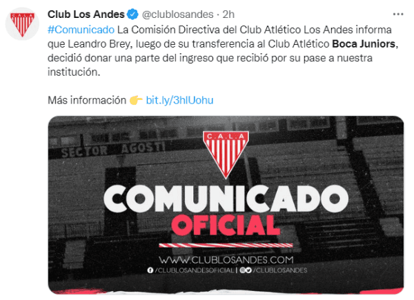 Además de empezar a estar en boca de los hinchas del club, Leandro Brey también protagonizó un acto que se ganó el aplauso de muchos luego de que el Mil Rayitas lanzara un comunicado oficial en agradecimiento a su exjugador. “La Comisión Directiva del Club Atlético Los Andes informa que Leandro Brey, luego de su transferencia al Club Atlético Boca Juniors, decidió donar 1.800.000 pesos al predio de Villa Albertina, lugar donde realizó toda su formación deportiva”, indicó el club de Lomas para dar a conocer una enorme noticia para la institución.