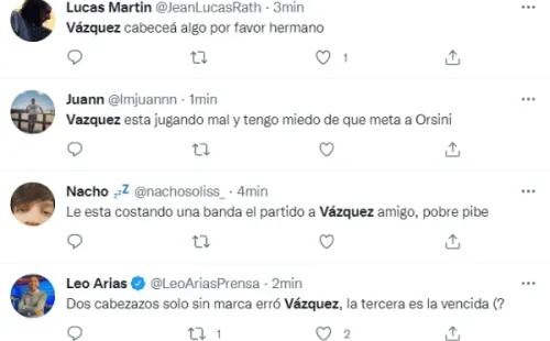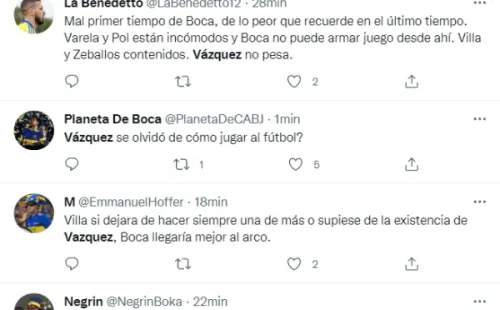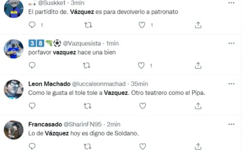 Las críticas de algunos hinchas en Twitter tuvieron como apuntados a Juan Ramírez y Nicolás Figal, entre otros, pero la pálida performance en ofensiva del Xeneize hizo que Luis Vázquez padeciera los comentarios en redes, convirtiéndolo en una de las primeras tendencias de la web del “pajarito azul”.