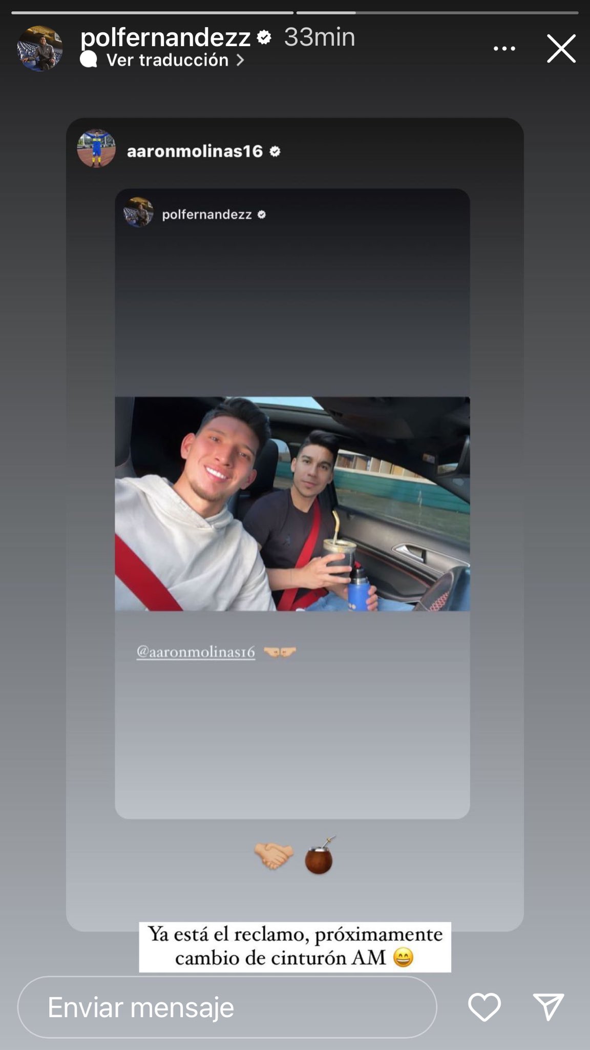Luego de una jornada de trabajo, Aaron Molinas y Pol Fernández se retiraron del predio de Ezeiza en el mismo auto -conducido por el ex Racing- y decidieron tomarse una foto juntos para luego postearla en redes sociales. El volante más experimentado fue el encargado de subir la imagen a las historias de Instagram, pero los hinchas del Xeneize no les perdonaron un detalle más que particular.
