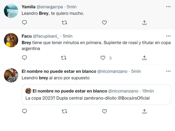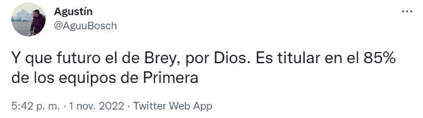 “Qué futuro el de Brey, por Dios. Es titular en el 85% de los equipos de Primera”, destacó @AguuBosch en Twitter, dando a entender que, ante una posible salida de Agustín Rossi, en el Xeneize deberán apostar por el juvenil surgido de las inferiores del Milrayitas.