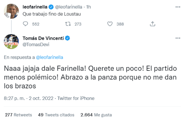 “Que trabajo fino de Loustau”, escribió en Twitter el reconocido jornalista de TyC Sports y Olé, entre otros, acerca del arbitraje en el partido que se disputó en la tarde del domingo. No es la primera vez que Farinella apunta contra los jueces que dirigen los partidos de Boca, por lo que los hinchas del club de La Ribera contraatacaron en redes sociales.