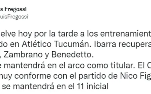 Según añade Fregossi, el arco estaría ocupado nuevamente por Agustín Rossi y el tridente técnico deberá decidir qué hacer con los futbolistas que regresan a la convocatoria. Marcos Rojo, Darío Benedetto, Frank Fabra y Carlos Zambrano estarán disponibles vs. Atlético Tucumán, pero aún resta definir si van desde el arranque o miran el partido desde afuera.