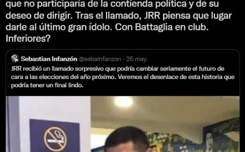El periodista partidario Sebastián Infanzón reveló que una charla entre al actual vicepresidente y Adrián Ruocco, el agente de Carlitos, puede derivar en el arribo de Tevez a Boca. “Román recibió hace días el llamado de Adrián Ruocco, representante de Carlitos Tevez. Supo antes que nadie que no participaría de la contienda política y de su deseo de dirigir. Tras el llamado, JRR piensa qué lugar darle al último gran ídolo. Con Battaglia en club… ¿Inferiores?”, señaló. ¿En qué rol podría sumarse?