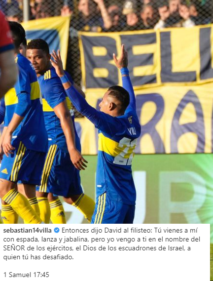 Con un pasaje bíblico, Villa escribió: “Entonces dijo David al filisteo: Tú vienes a mí con espada, lanza y jabalina, pero yo vengo a ti en el nombre del SEÑOR de los ejércitos, el Dios de los escuadrones de Israel, a quien tú has desafiado.1 Samuel 17:45“. Y junto a esto, una colección de fotos suyas del partido ante Ferro.