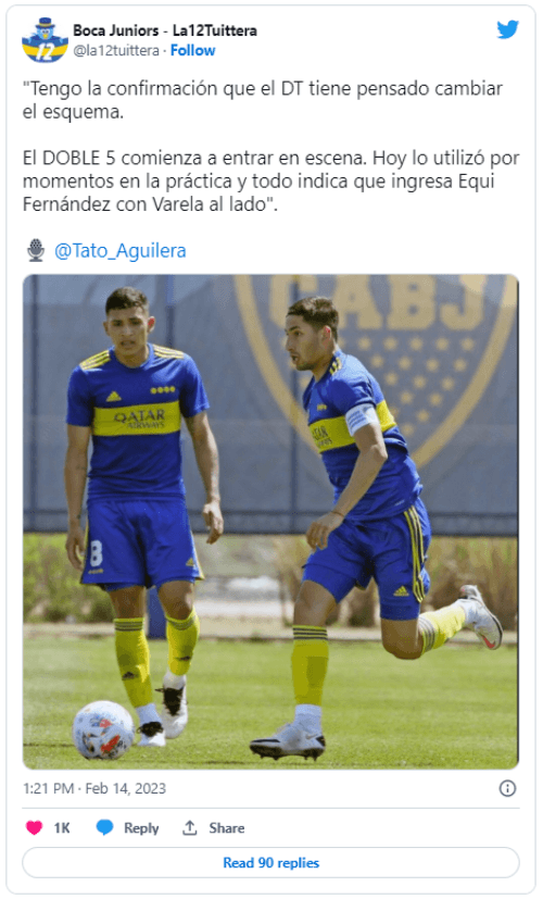 La información la dio el periodista Tato Aguilera en TyC Sports: “Tengo la confirmación que el DT tiene pensado cambiar el esquema. El doble 5 comienza a entrar en escena”. Todo indica que la mitad de la cancha estará conformada por Equi Fernández y Alan Varela. Se viene el 4-4-2.