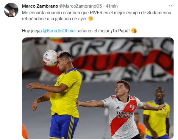 Curiosamente, Marcos, el hermano del defensor peruano, también hizo hincapié en aquel Superclásico para expresar irónicamente su disconformidad en Twitter por los que aseguran que “River es el mejor equipo de Sudamérica” y posteó: “Hoy juegaBoca Juniorsseñores el mejor ¡Tu Papá!”. Picante.
