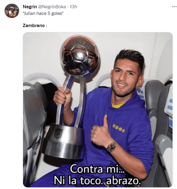 El gran desempeño de Carlos Zambrano contra River en aquel partido, sobre todo marcando a Julián Álvarez, es una constante entre los fieles del Xeneize para burlarse de la figura del equipo del Muñeco. Es por eso que, luego de la histórica velada del “Araña”, los memes/cargadas no se quedaron atrás y reflotaron en redes sociales.