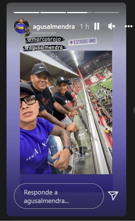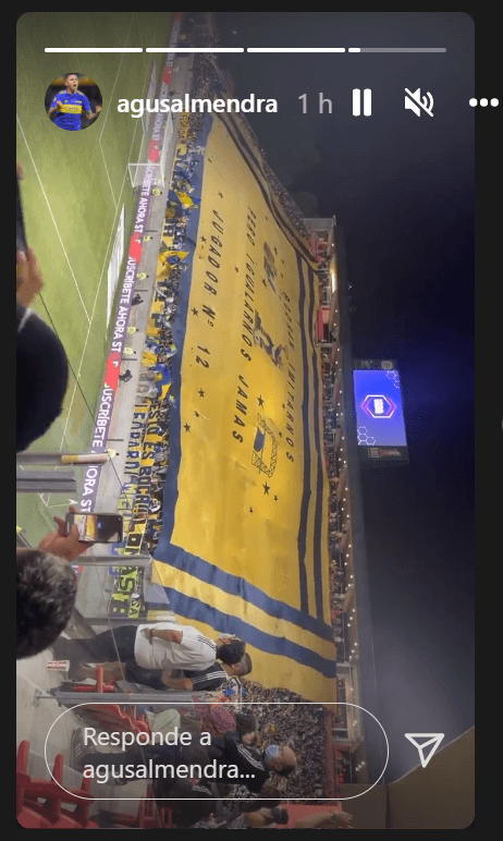 A través de su cuenta en Instagram, Almendra compartió una serie de stories, donde primero fotografió a su hija (NdR: preservamos la integridad de la menor, por lo que no compartimos la imagen), además de mostrarse junto al ex Manchester United y un amigo. Acto seguido, filmó a la hinchada del Xeneize luego de que los dirigidos por Battaglia salieran al campo de juego.