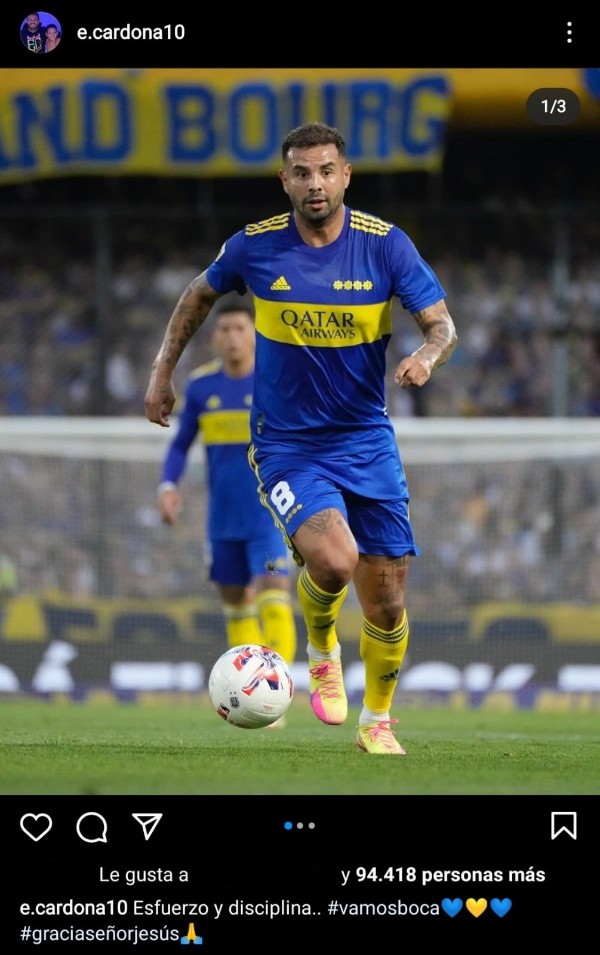 Luego del partido, Edwin publicó una foto en su cuenta de Instagram y envió un mensaje. “Esfuerzo y disciplina… #vamosboca #graciaseñorjesús”, escribió el mediocampista ofensivo.