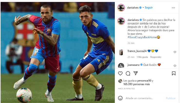 Más de cinco años pasaron para que Dani Alves vuelva a vestirse de Culé. Por eso, tras el match, aprovechó para mostrar su felicidad:“Sin palabras para descifrar la sensación sentida nel día de hoy después de + de 5 años de espera!! Ahora toca seguir trabajando duro para lo que viene”.